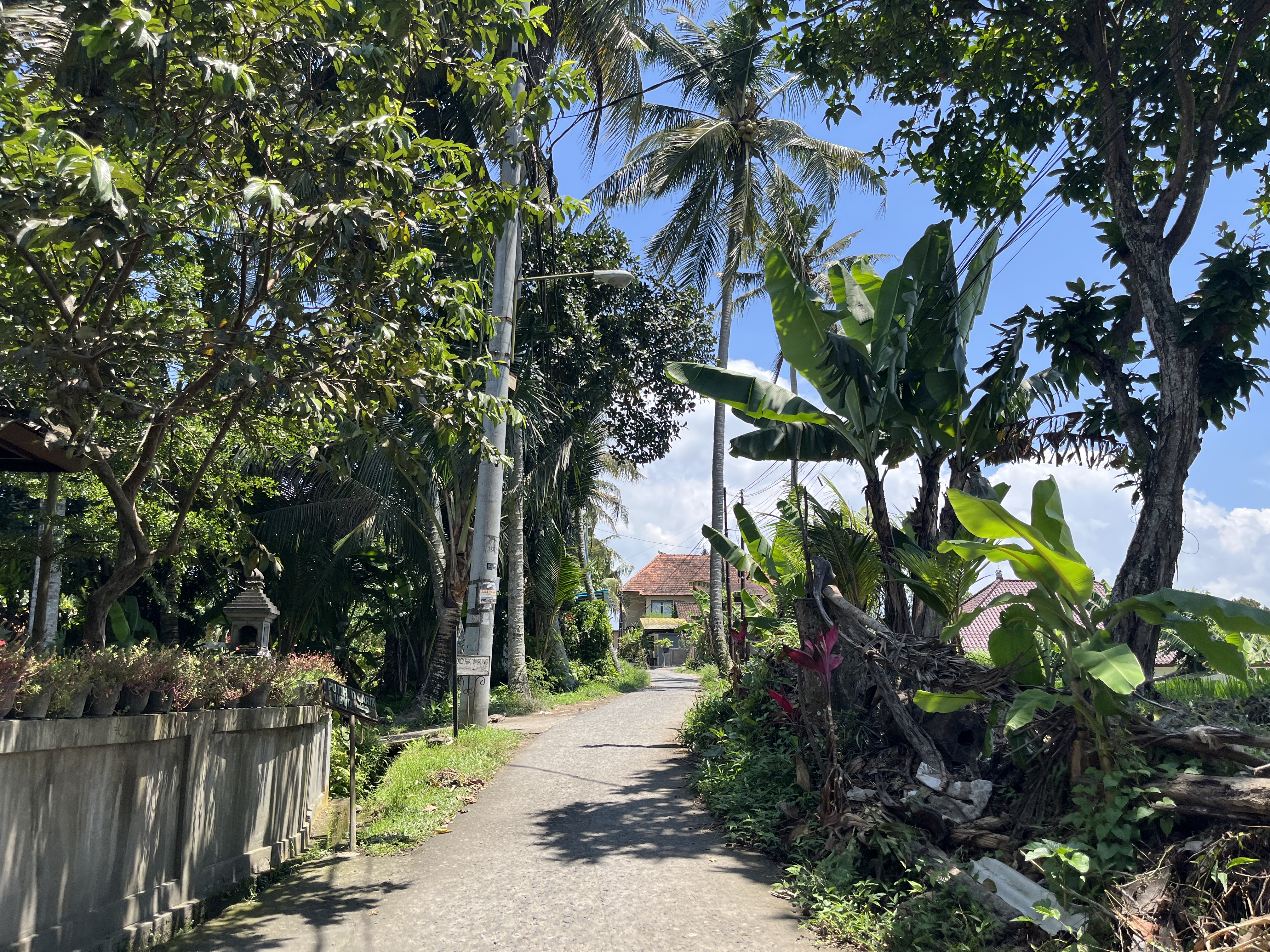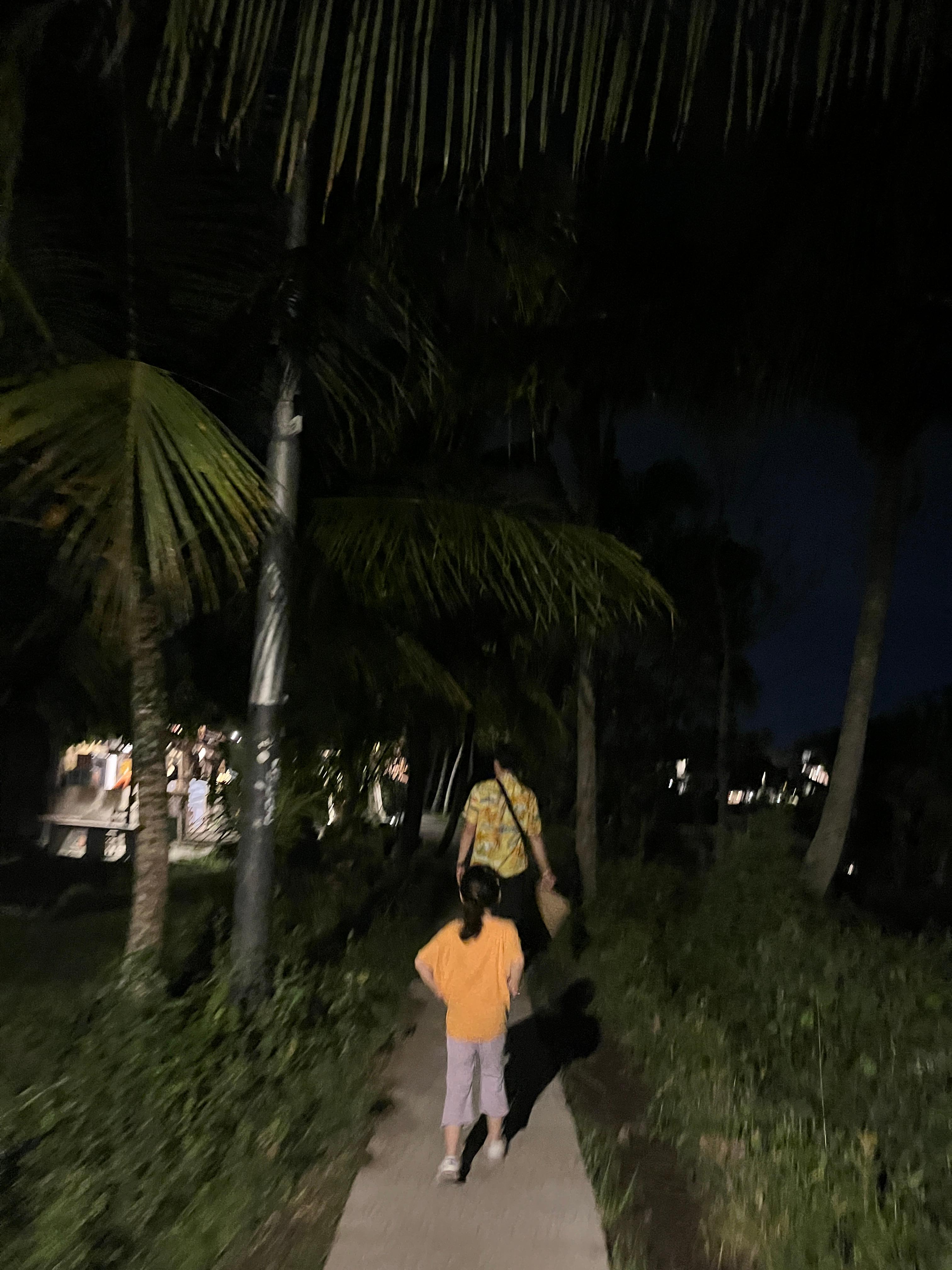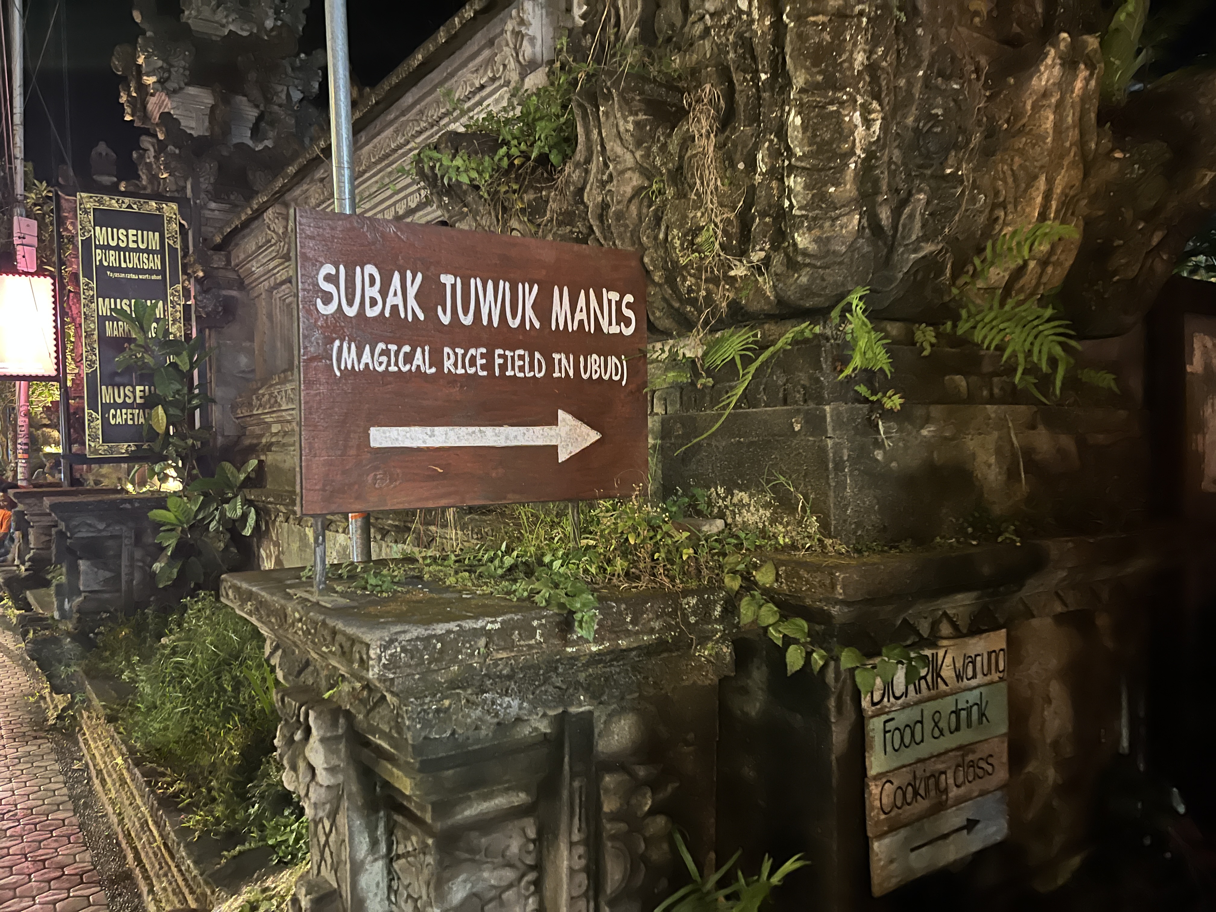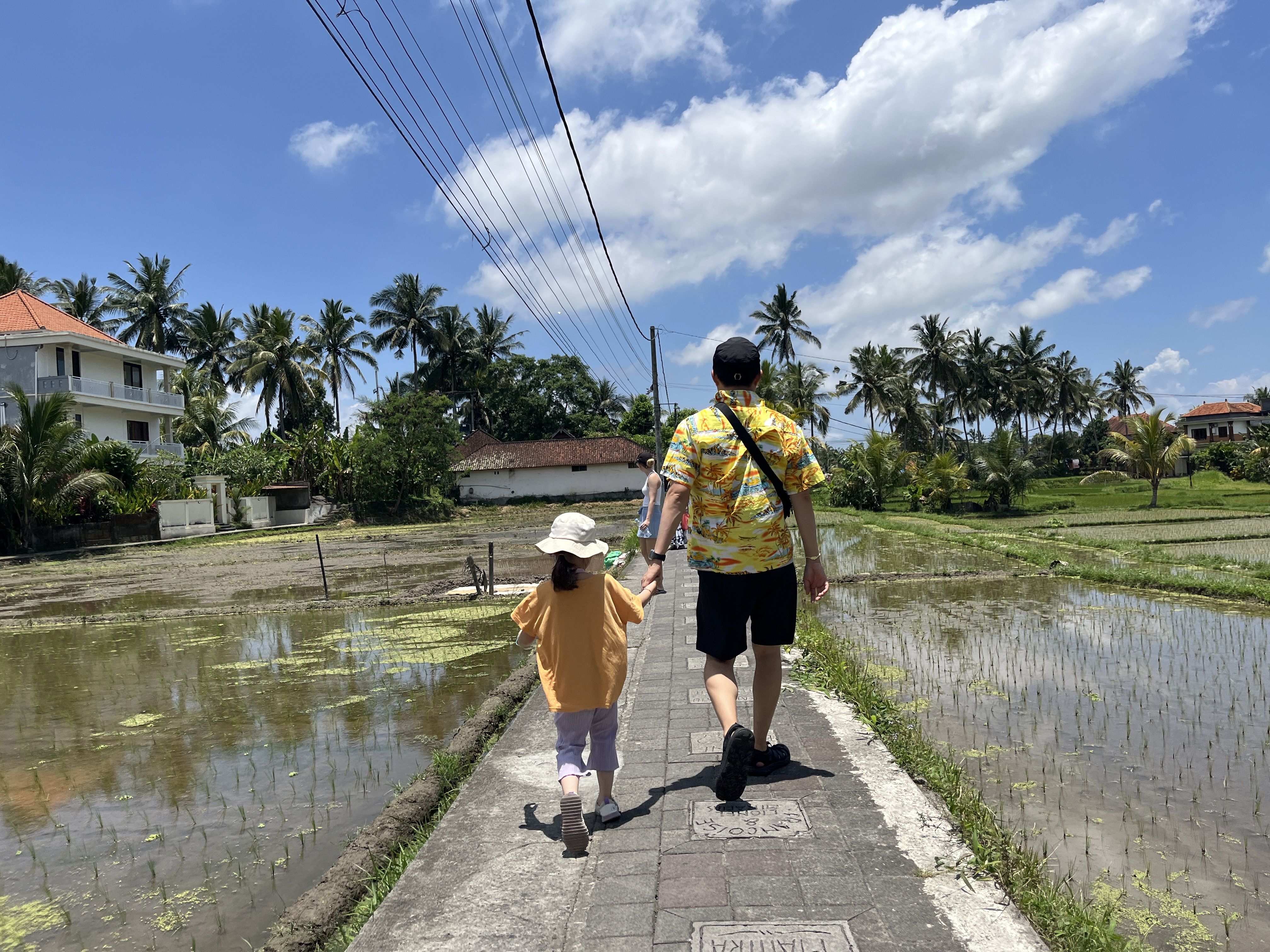 불빛이 화려한 우붓시내와는 달리 라이스필드는 농사짓는 시골이라 깜깜하고 길도 고르지 않다. 2025년부터는 관광객들로부터 기부를 받아서 판판한 돌길을 만들기 시작해서 흙길과 함께 콘크리트 돌길이 함께 공존한다. 지금도 콘크리트 돌길은 기부를 받고 있다. 그리고 관광객이 늘어나면서 중간중간 사람이 지나가면 자동으로 가로등이 켜지는 곳도 몇 개 있다. 참고로 여긴 적도라 우리나라 여름처럼 계절이 덥다고 해가 8시에 지는 게 아니라 해가 6-7시 사이에 금방 지기 때문에 밤 8시면 생각보다 아주 깜깜한 편이다.