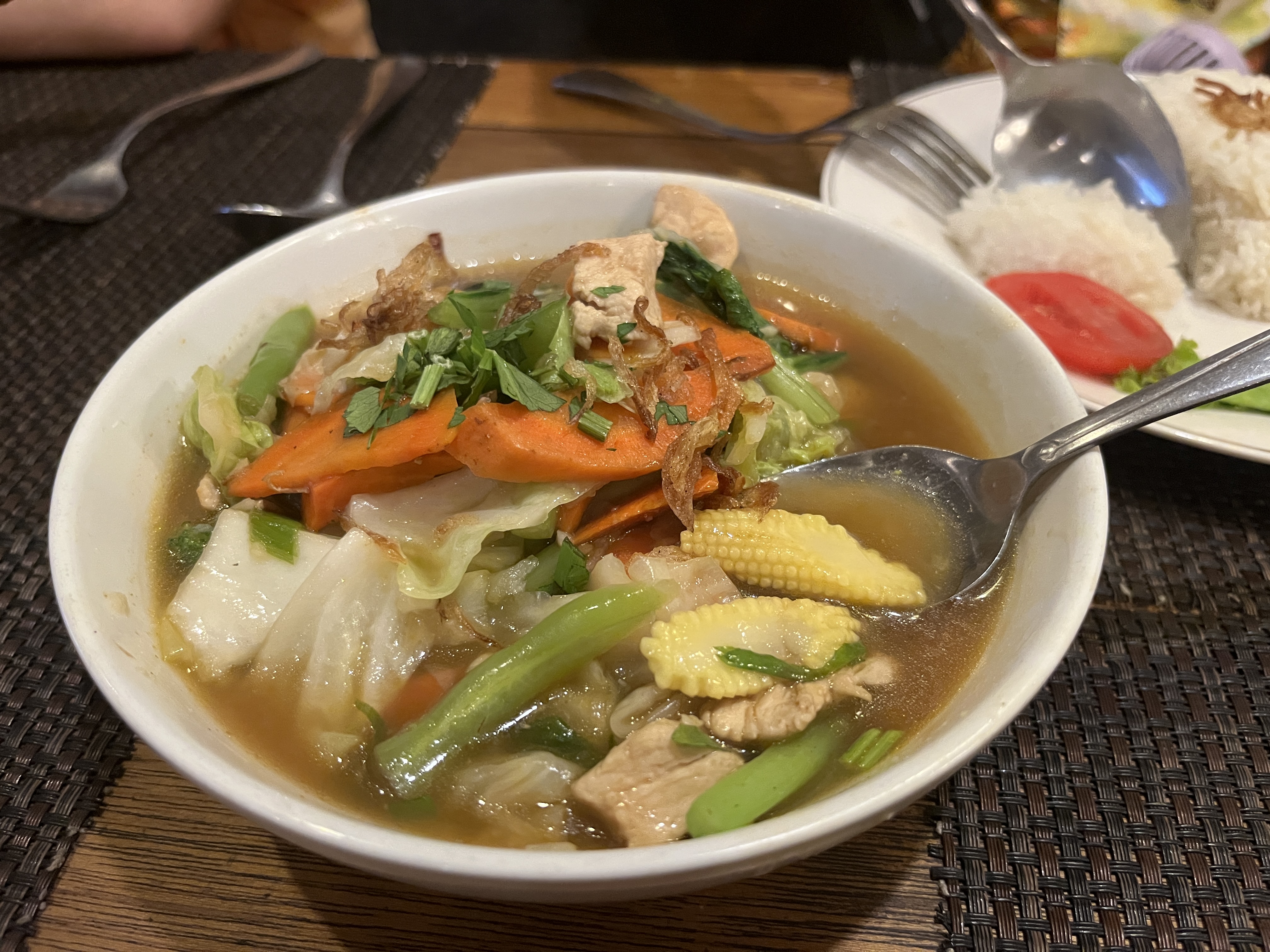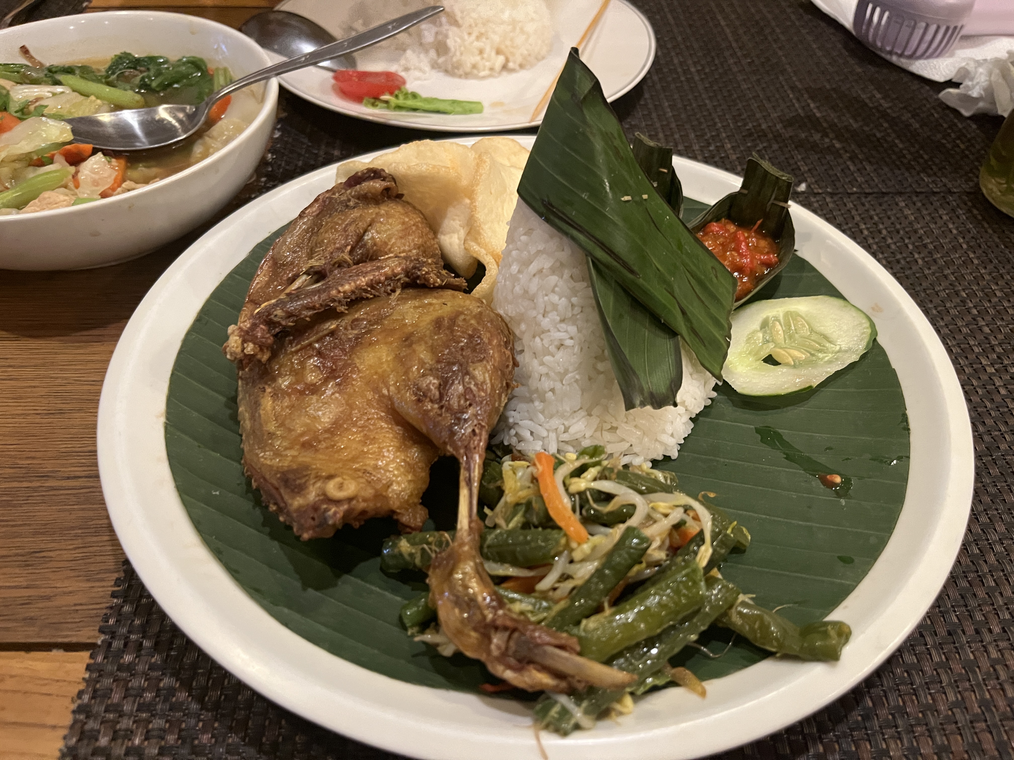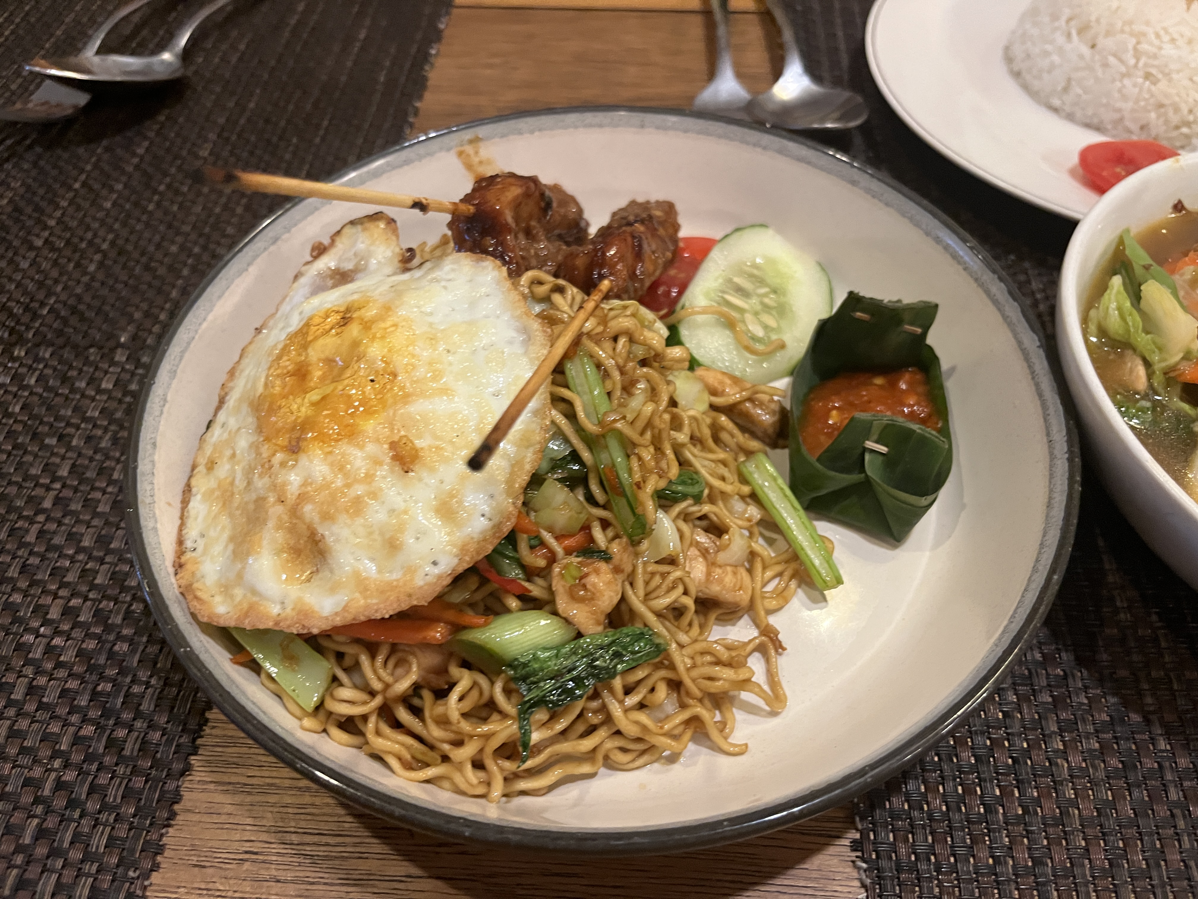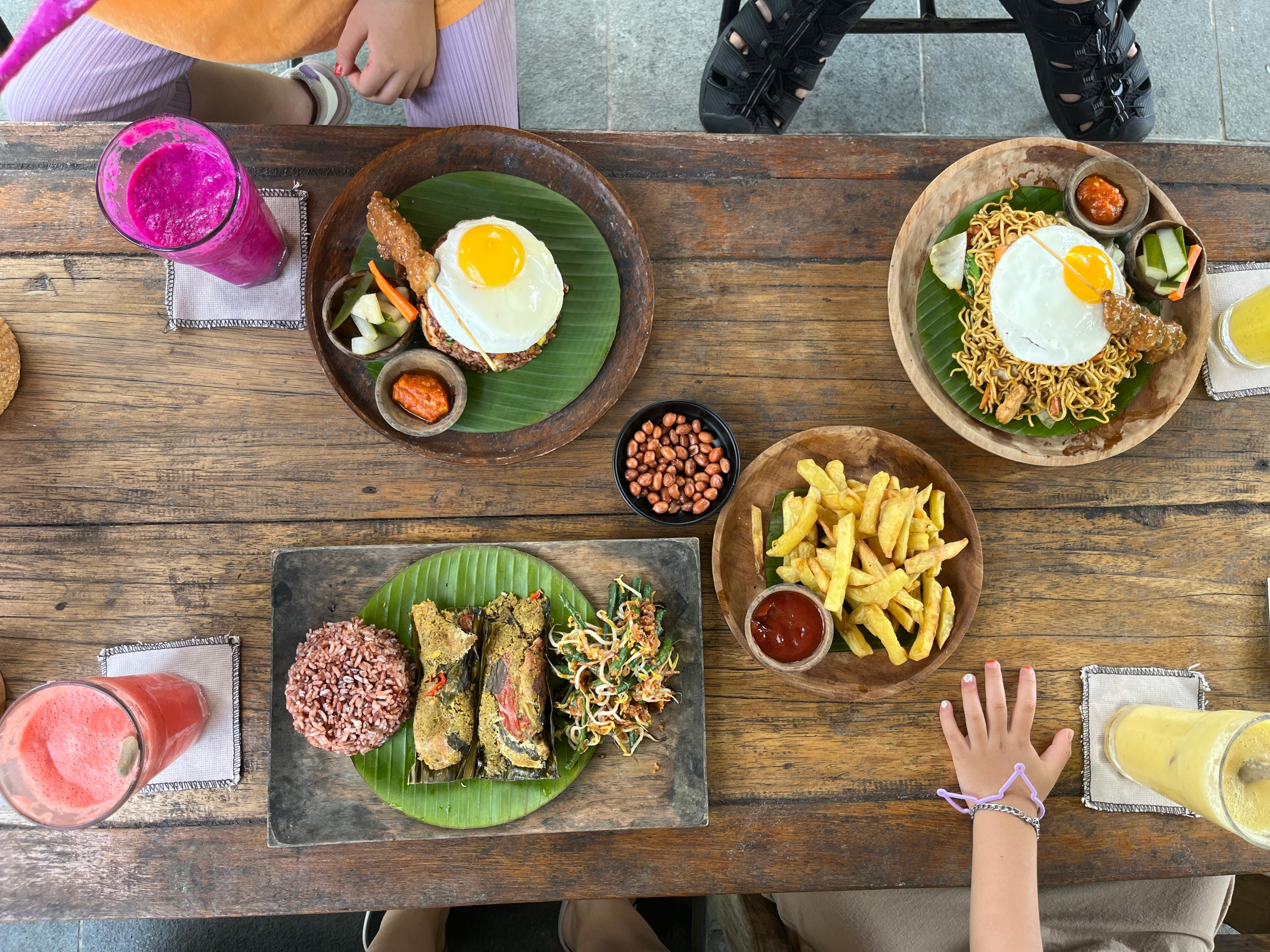 밤에 캐짝댄스를 보러 가야 해서 연꽃사원 길 건너 있는 식당에 가서 Mi Goreng과 Fried Duck, Cap Cay(짭자이)를 먹었다. 발리 닭/오리는 살이 덜 쪘는지 다릿살이 통통하지 않고 길쭉했다. 개인적으로 짭짜이가 진짜 맛있었는데 나중에 집에서 또 해 먹고 싶은 마음이 들었다. 아이들은 사테를 가장 좋아했다.