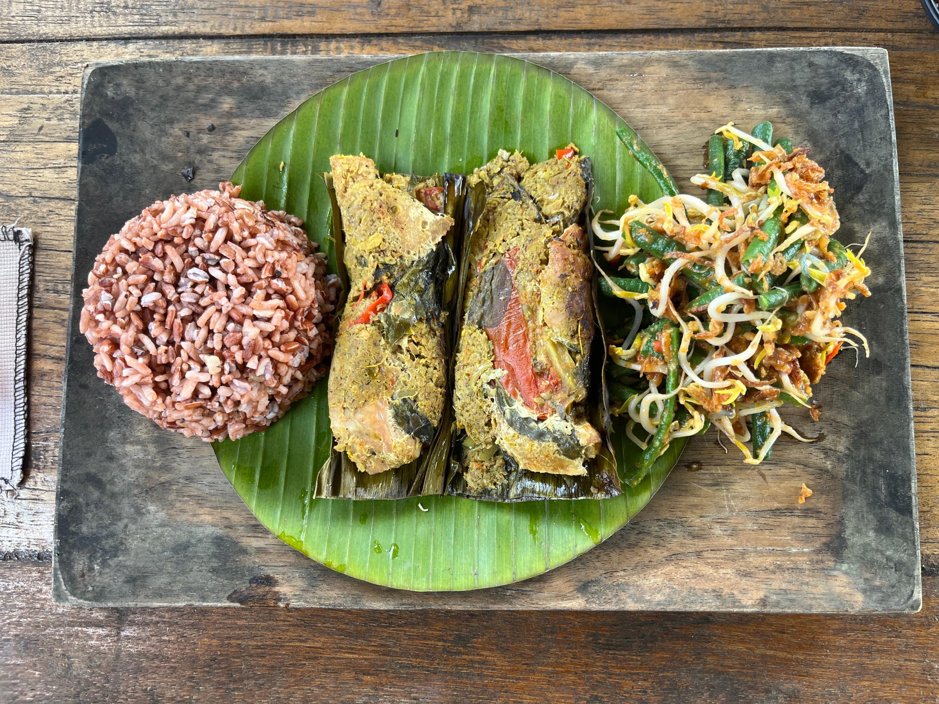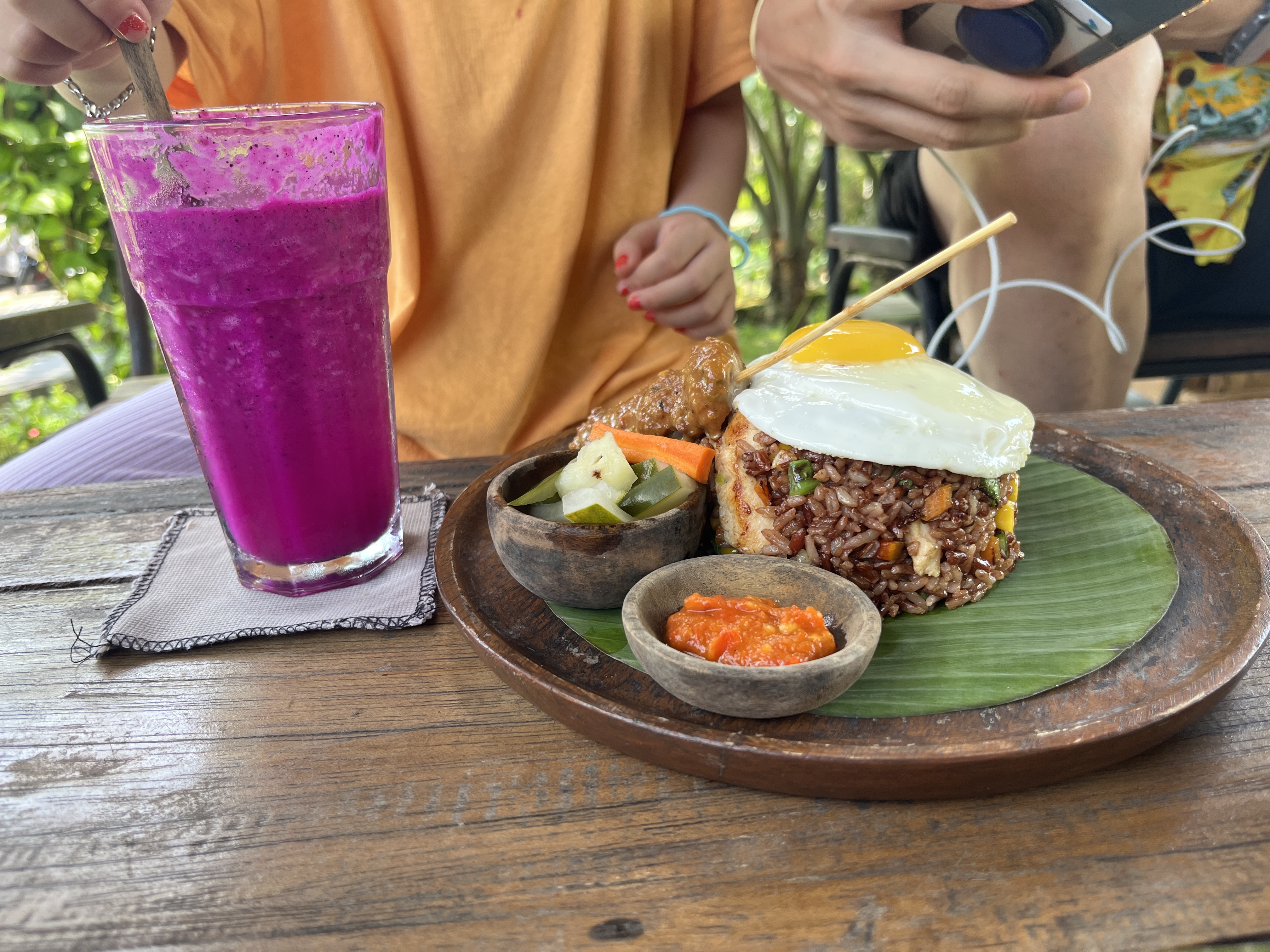 Rice Field 스무디 망고+민트+진저맛 (40K), Putu 스무디 파인애플, 용과, 라임 맛 (35K), Iluh 스무디 수박+파인애플+진저맛 (35K), Kadek 스무디 망고+바나나+딸기맛 (35K), Tuna Sambal Matah (바나나잎에 찐 참치와 여러 가지 소스 그리고 적색쌀이 있는 음식. 갈치조림 느낌), Mie Goreng Ayam (55K), Nasi Goreng Ayam (55K), Potato fried (25K),