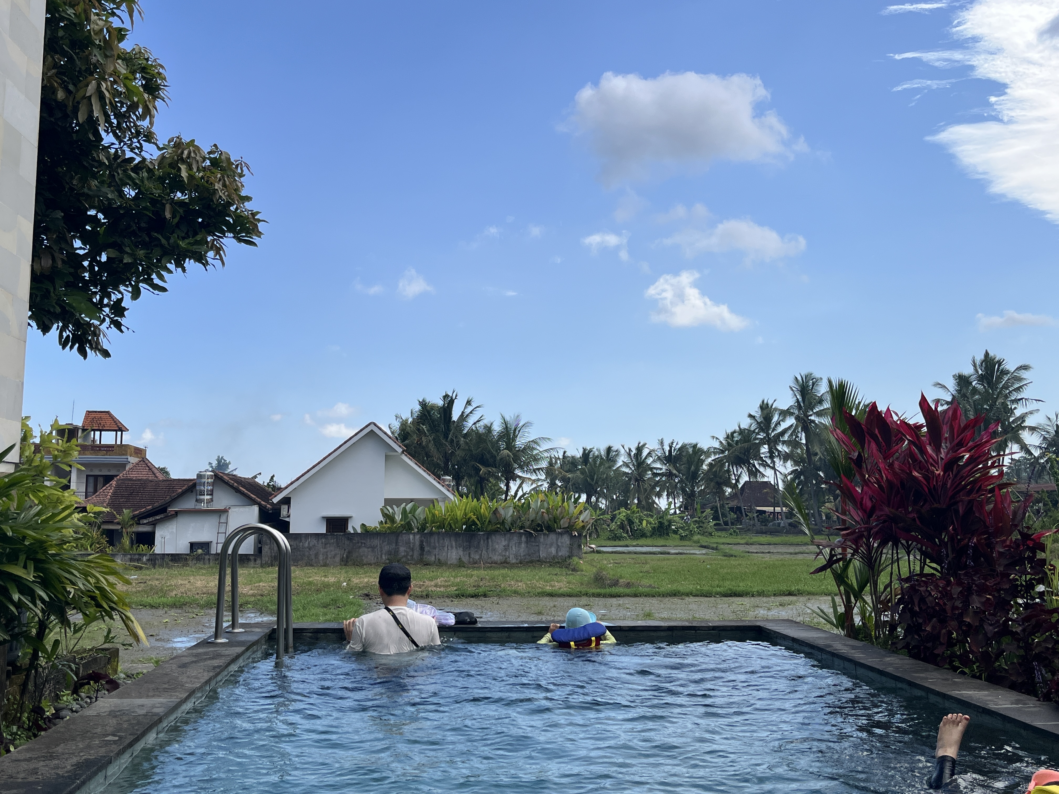 밥을 먹고 나서 숙소에 돌아오니 너무 더웠다. 아직 하루 일정을 마치지 않아서 씻고 외출해야 한다는 귀차니즘이 있었지만 우리가 이용하지 않으면 비싸게 이곳에 온 이유가 없었다. (여행 일정 중 길리 다음으로 두 번째로 비싼 숙소였음) 수영장 물은 한낮의 더위로 딱 알맞은 온도였고 야외에 있는 것이라 나뭇잎 같은 부유물이 떠다니고 실내수영장처럼 깨끗한 걸 기대할 수 없었지만 직원들이 매일마다 소독약을 타고 청소하기 때문에 수질이 문제 될 것은 없다고 본다. 참고로 대부분 호텔수영장 물은 1.5미터로 아이들에게는 깊기 때문에 튜브보다는 구명조끼를 가져오는 것이 더 좋다.