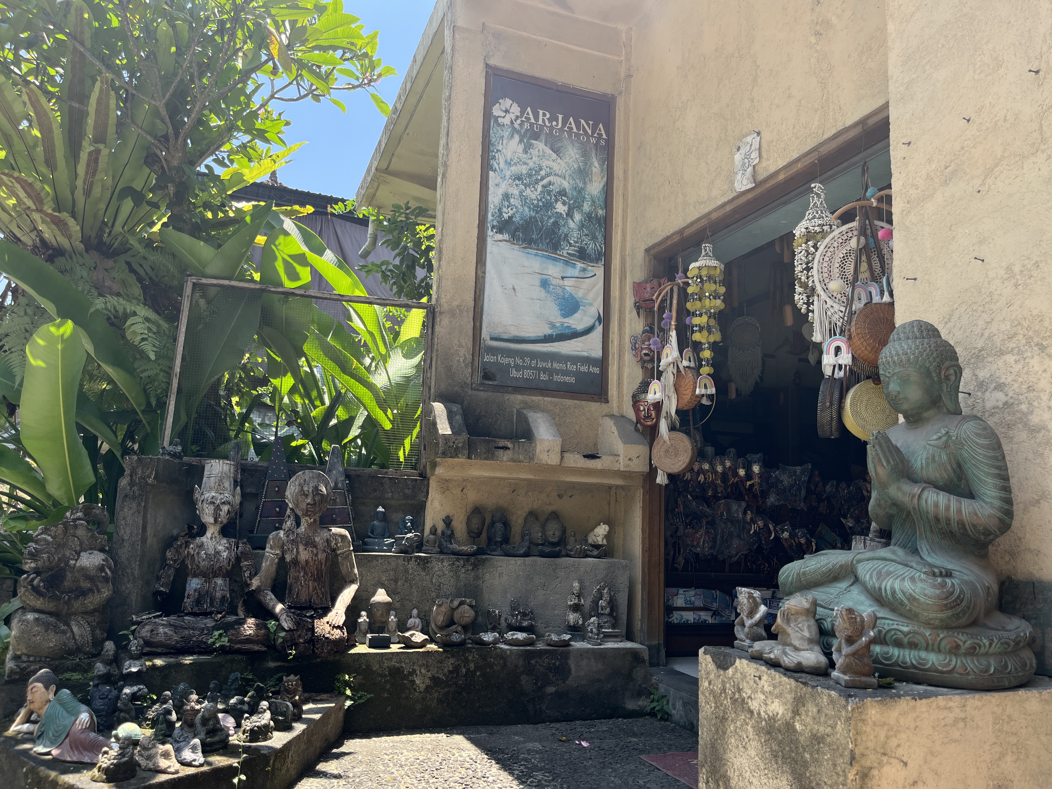 다음 숙소는 우붓왕궁을 지나 시장골목 안쪽으로 들어가서 라이스필드 안에 있는 곳으로 반딧불이가 종종 나온다는 곳이었다. 우리가 어제 장도 보고 해서 짐이 어마어마하게 많았는데, 라이스필드 안에 있는 숙소들은 택시 다닐 수 없는 논길이므로 어떻게 짐을 옮기나 걱정이었다. 다행히 숙소에 오토바이가 있어서 우리를 태워다 줄 테니 걱정 말라고 했다. 우붓아트마켓 골목 끝에 Bale Banjar Ubud Kaja 기념품가게가 마을 입구인데, 여기까지 택시를 타고 와서 숙소 매니저를 기다렸다.