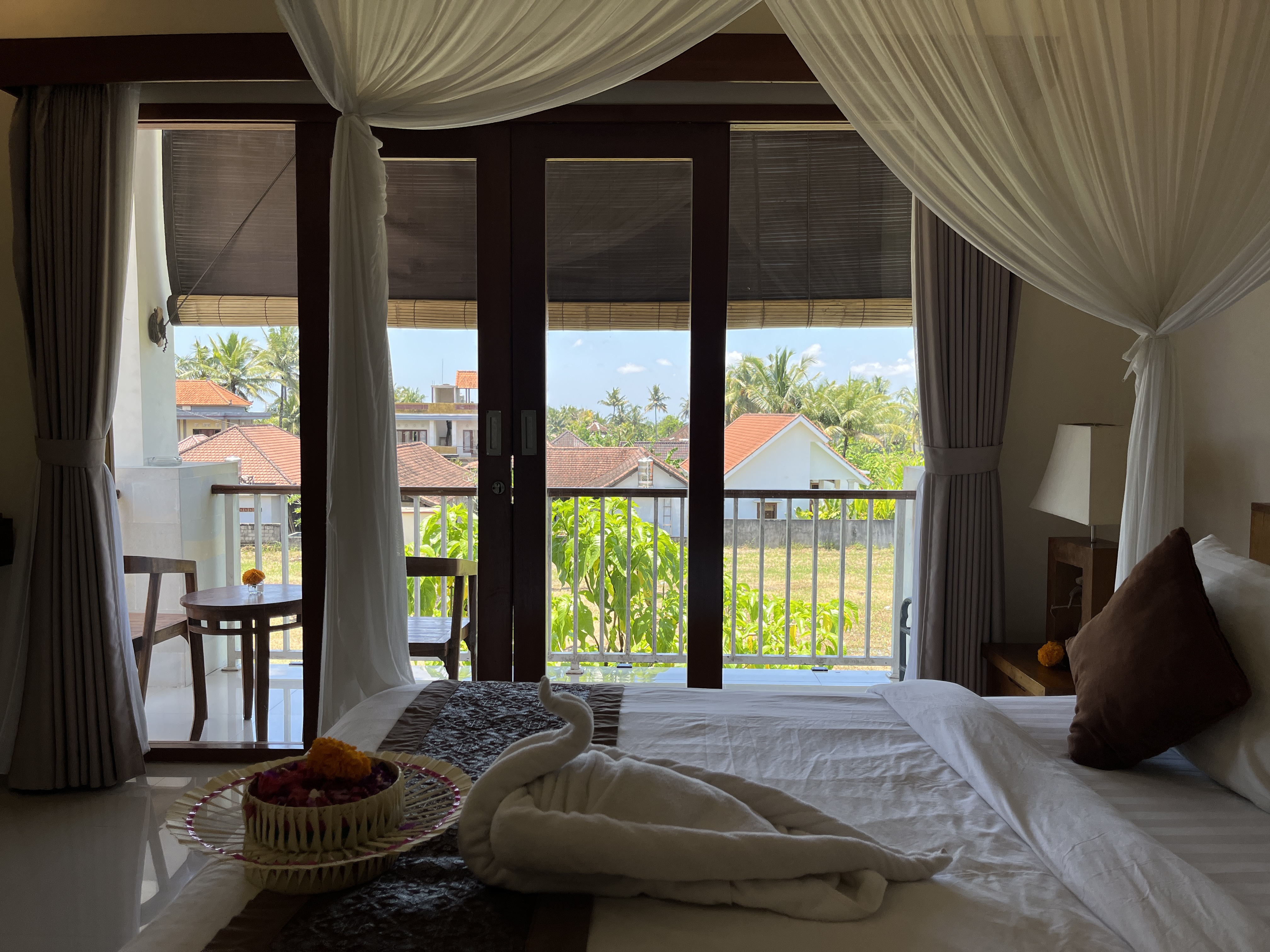 그리고 정말 다행히도, 먹을 음식들을 원래 체크인 시간인 오후 2시까지 시원하게 보관해야 했는데 우리가 도착하자마자 오전 11시에 바로 숙소를 사용할 수 있고, 덕분에 음식이 상할 걱정도 전혀 없었다. 숙소에 들어가 보니 에어컨을 풀가동해 두어서 들어서는 순간부터 시원함이 온몸을 감쌌고, 투명한 유리창 너머로는 푸른 정글이 펼쳐져 우리를 맞이하고 있었다. 그야말로 천국이 따로 없었다. 그리고 침대에는 꽃이 담긴 바구니와 한쌍의 백조가 예쁘게 장식되어 있어서 마치 신혼여행을 온 것 같았다. 체크인 전까지 한낮의 더위 속에서 어떻게 시간을 때워야 하나 고민했는데, 그런 걱정을 할 필요조차 없었다.