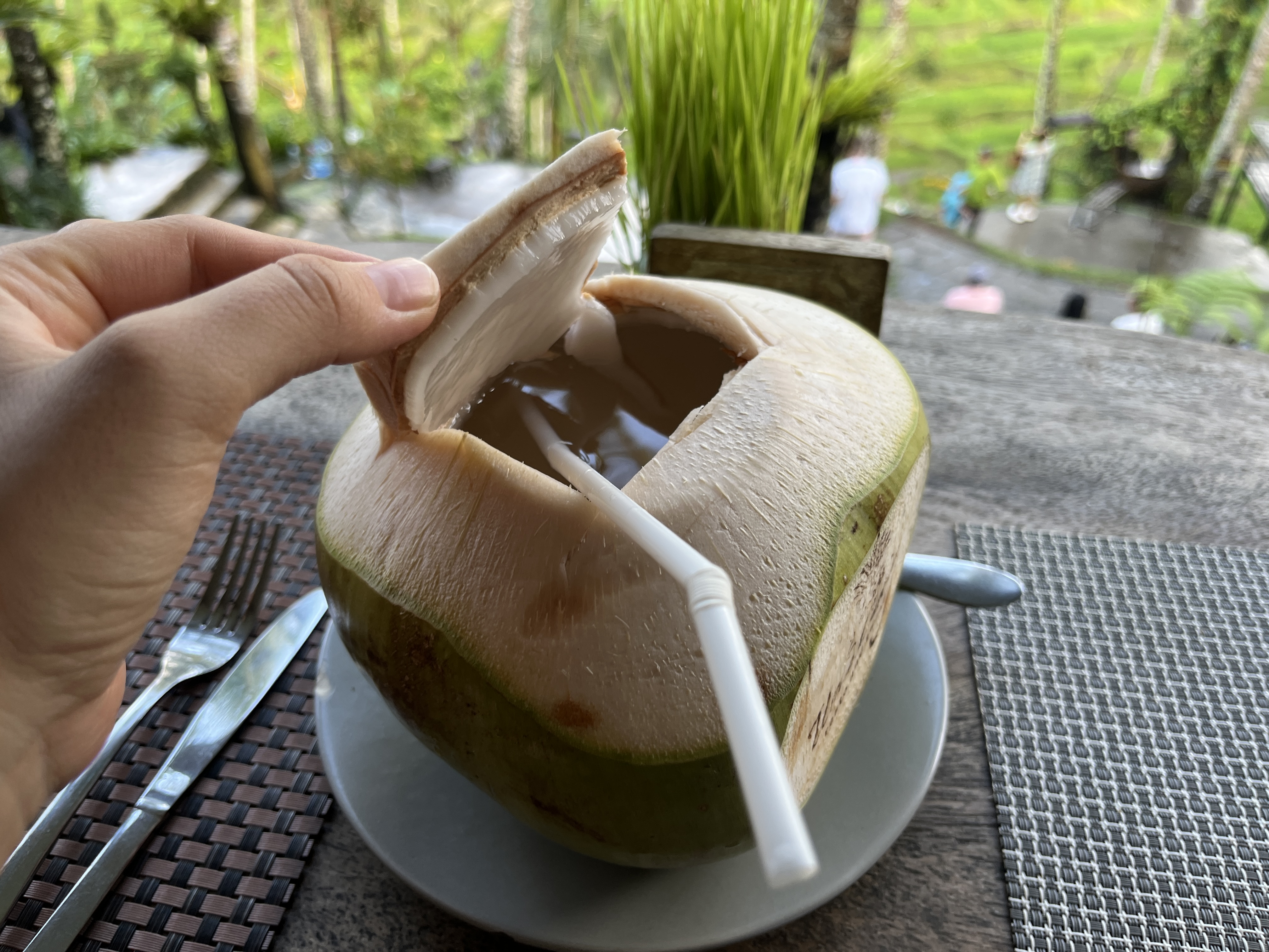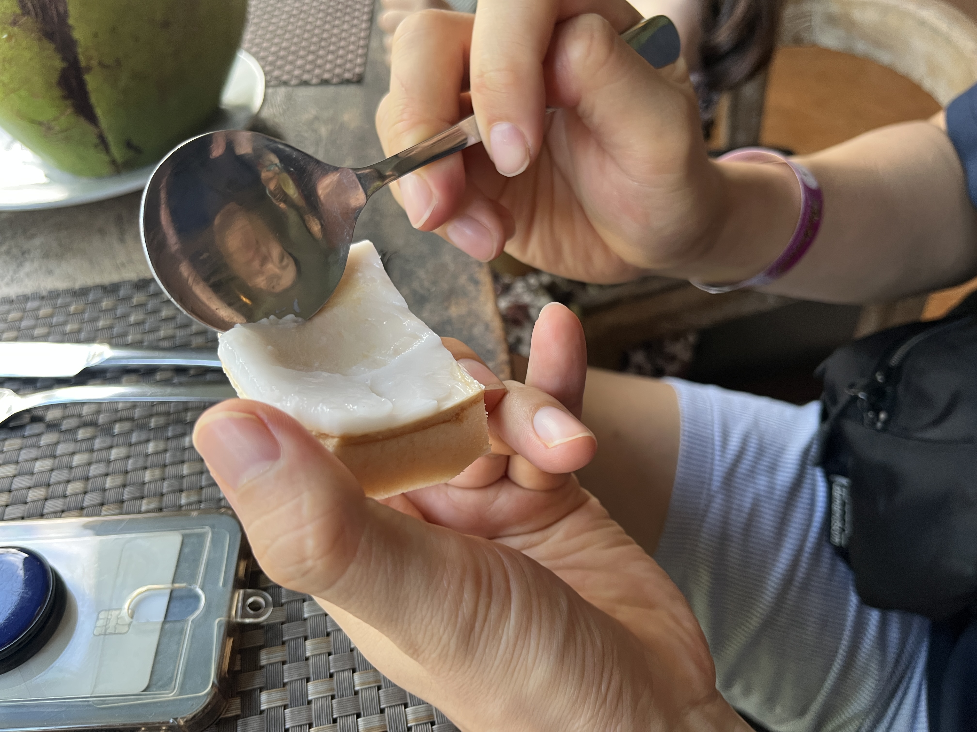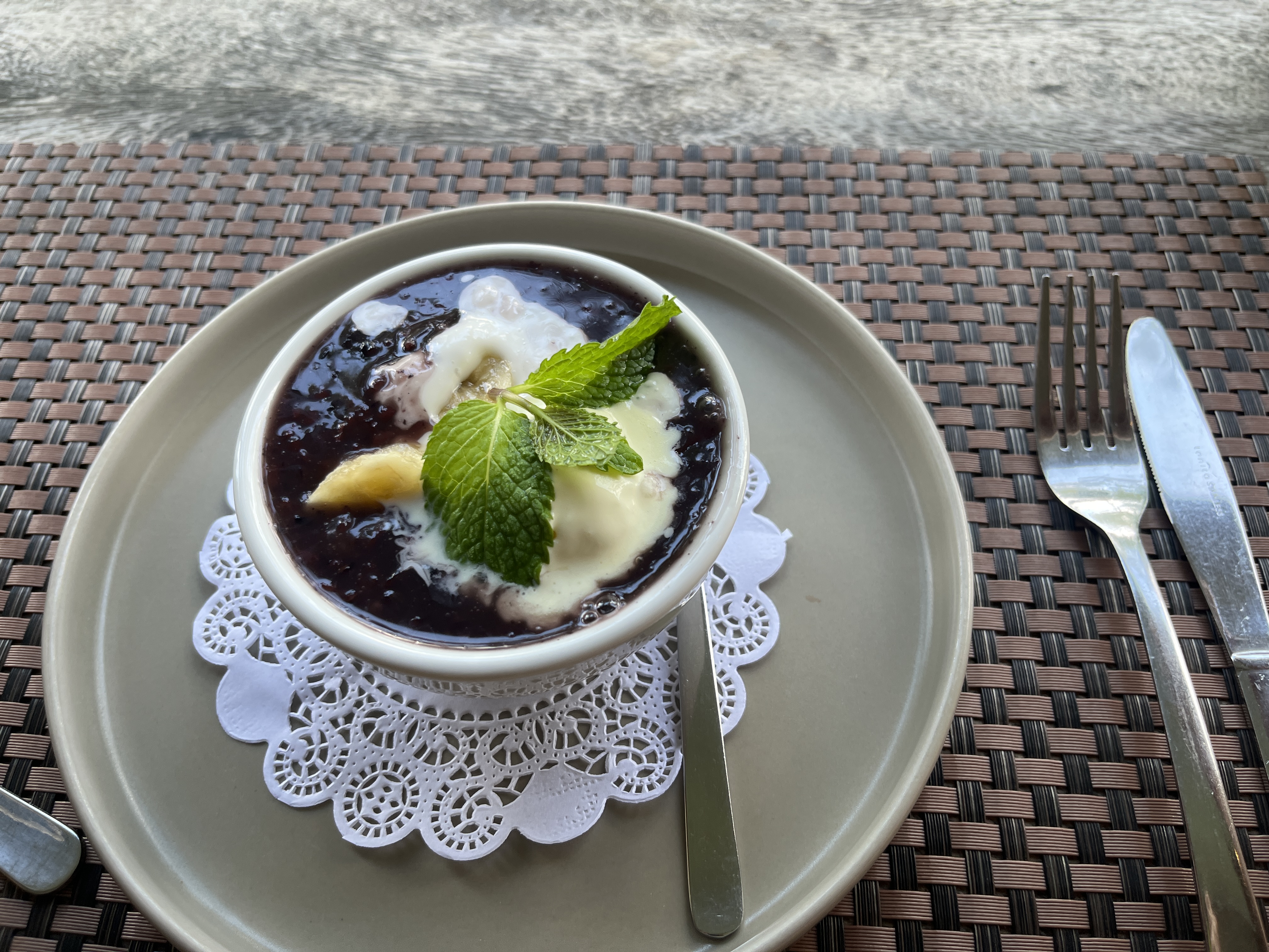 코코넛은 과육을 긁어먹으면 젤리같이 부드럽다. 코코넛 한통은 2~3명이 나누어 먹어도 될 만큼 양이 많다. 우리는 코코넛 남은 게 아까워서 보냉 텀블러에 담아 갔다. 바나나튀김은 달고 부드러우며 블랙라이스푸딩은 따뜻하고 달콤한 찹쌀죽이었다. 한 번쯤은 먹어보면 좋은 인도네시아 전통 디저트다.