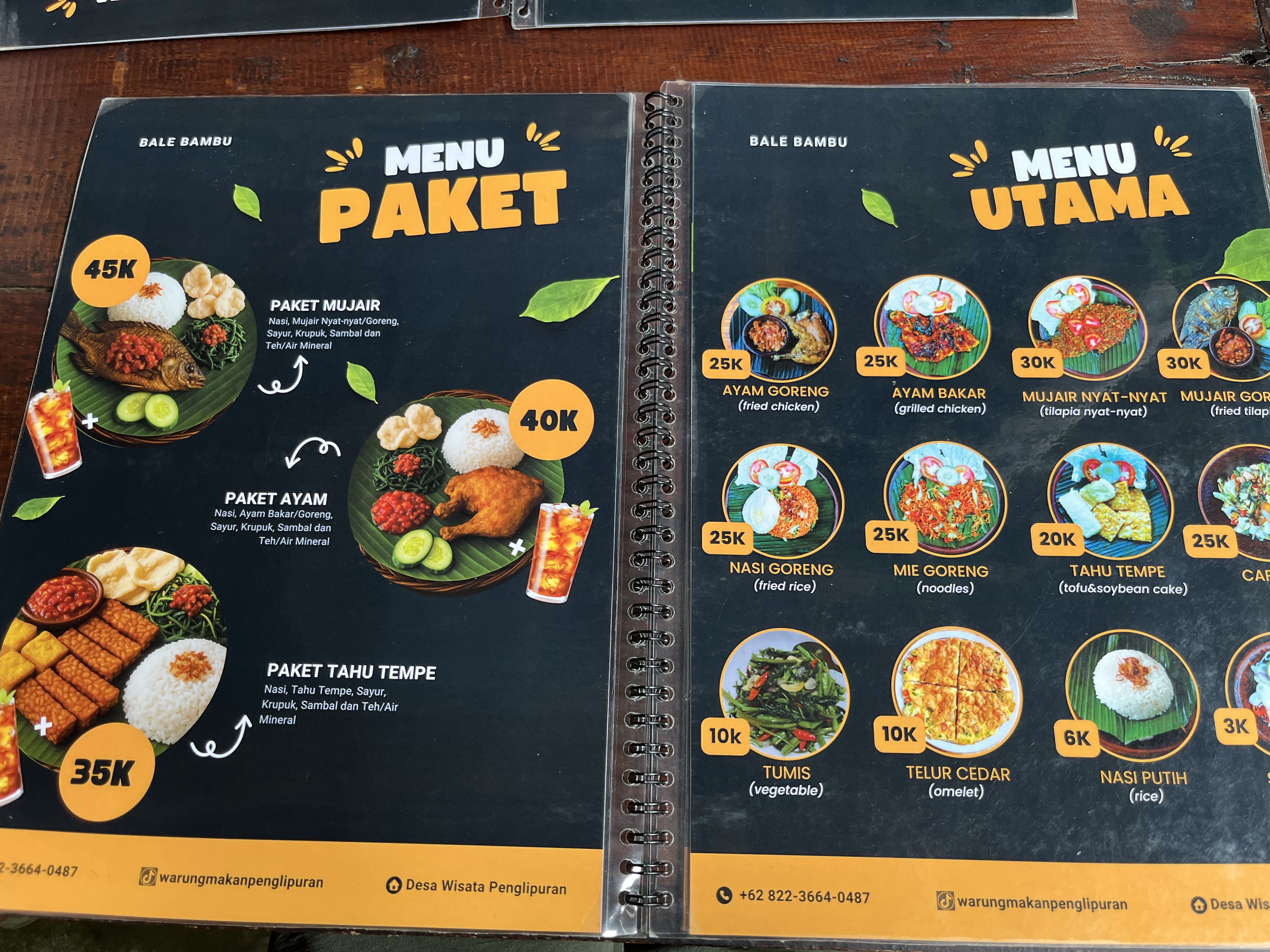 쁭리뿌란 마을 안에 들어가면 현지인들이 운영하는 음식점이 있다고 했는데, 도대체 어떤 음식을 파는지 정보를 알 수 없었다. 마을에서 30 분동 안 헤매다가 Mujair Lalapan이라는 아무 음식점이나 들어갔는데 매운 생선찜을 파는 곳이고 의사소통이 잘 안 되어서 도로 나왔다.