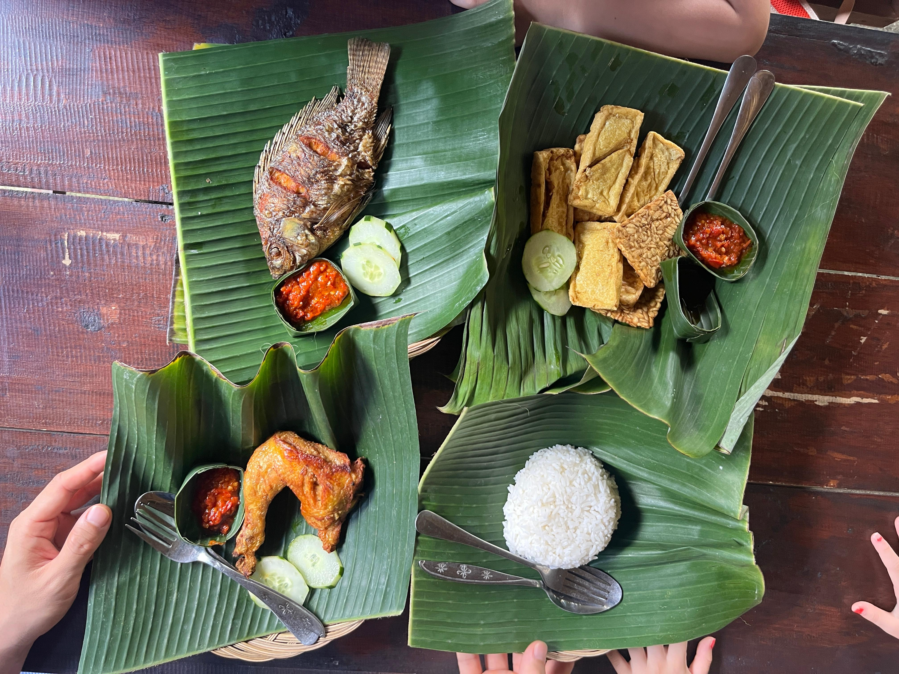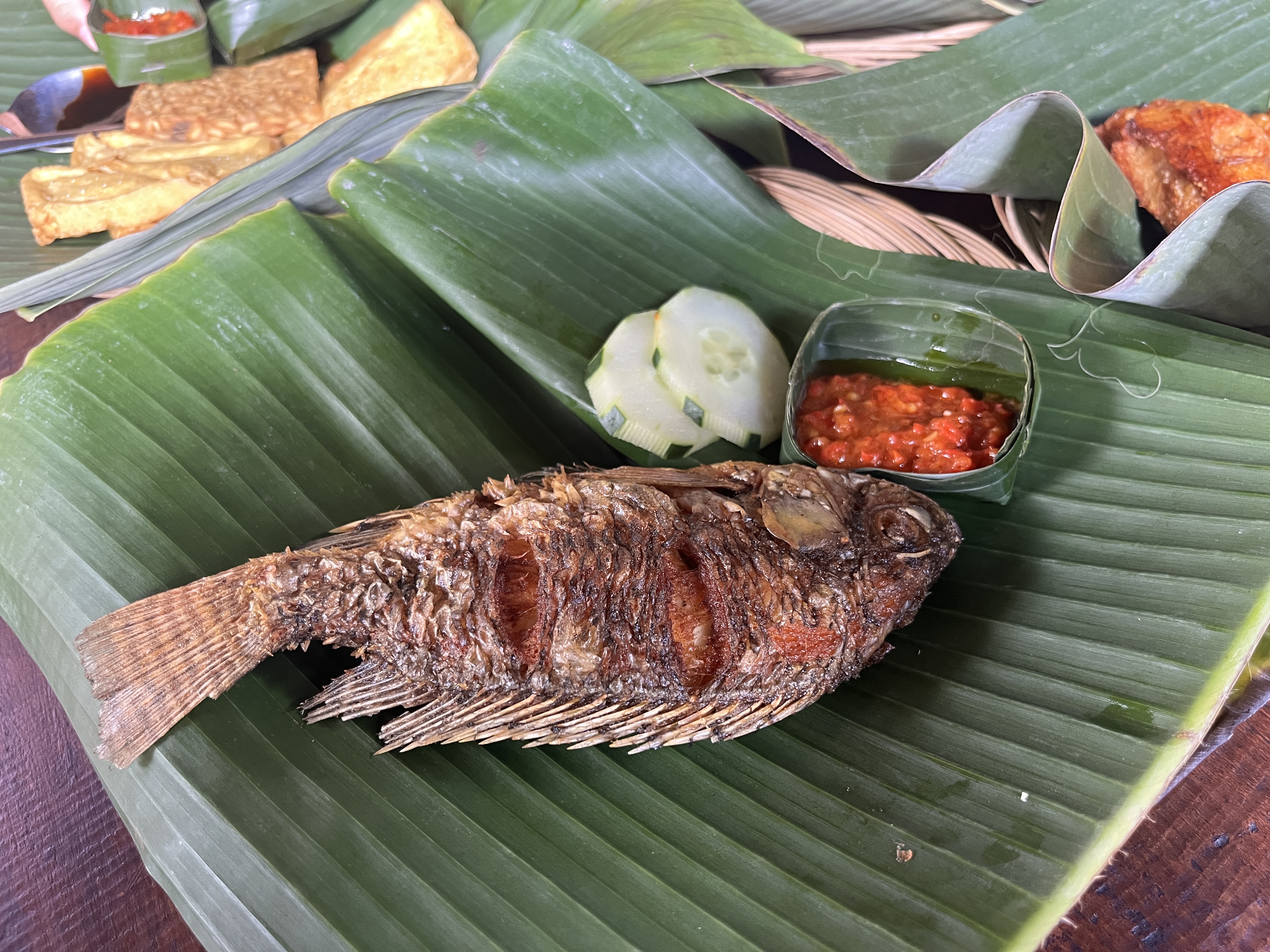 결국 30분 우리는 주차장으로 되돌아가 마을 입구에 있는 Bale Tempo Doeloe (옛 정자)라는 곳에서 먹기로 했다. 쁭리뿌란 지역은 고산지대이다 보니 바다가 멀어서 Mujair라는 틸라피아 민물고기를 주로 먹는다고 한다. 생선에 Nyat nyat라는 코코넛밀크를 곁들인 향신료를 발라먹기도 하고 튀겨먹기도 하는데 참 바삭하고 달콤 짭조름하니 맛있다. 나중에 한국에 돌아와서 어디에서 글을 읽었는데 틸라피아는 붕어처럼 더러운 물에서도 자라는 더러운 생선이니 코스트코에서 판다고 사지 않는 게 좋다고 한다.