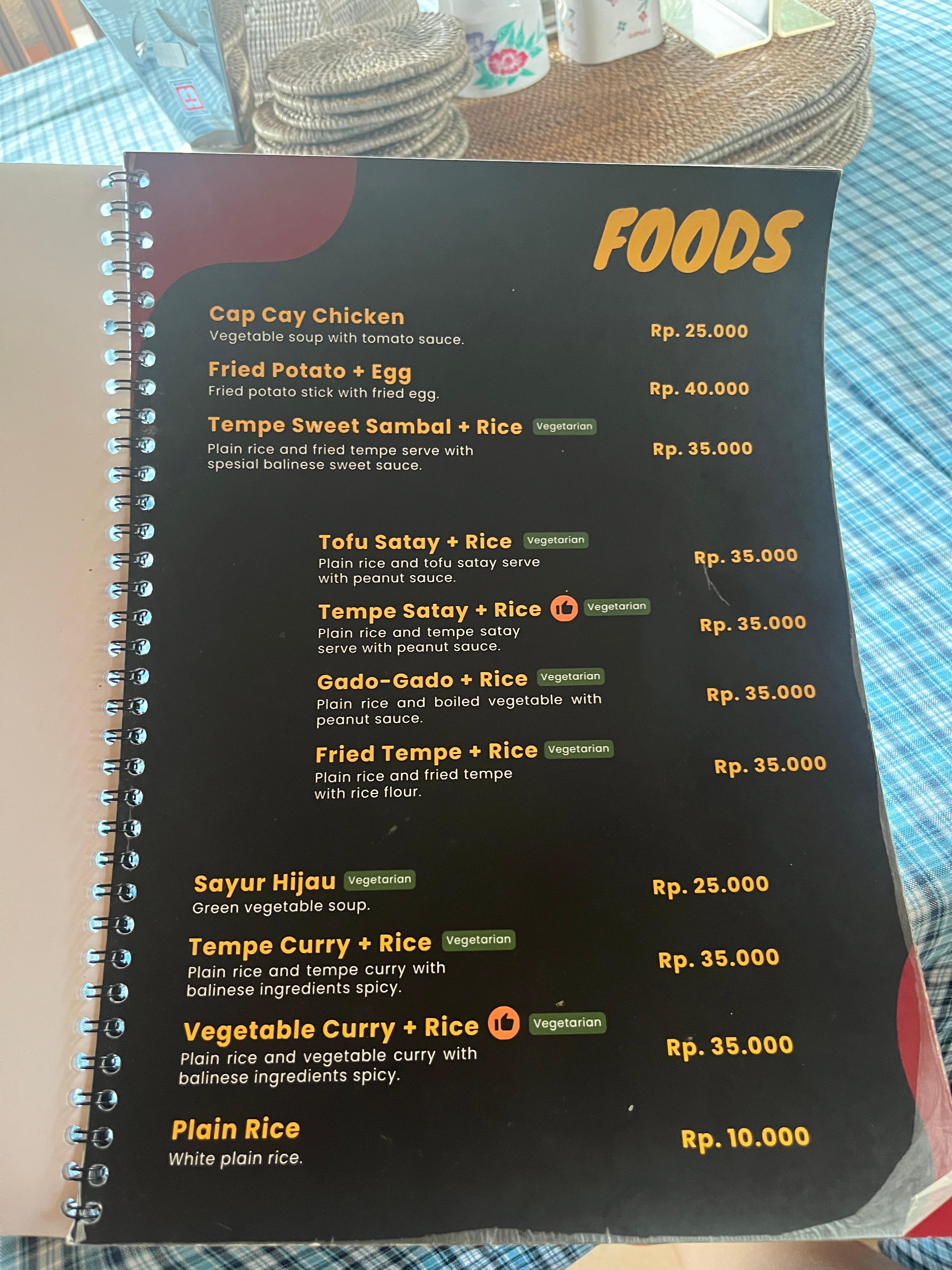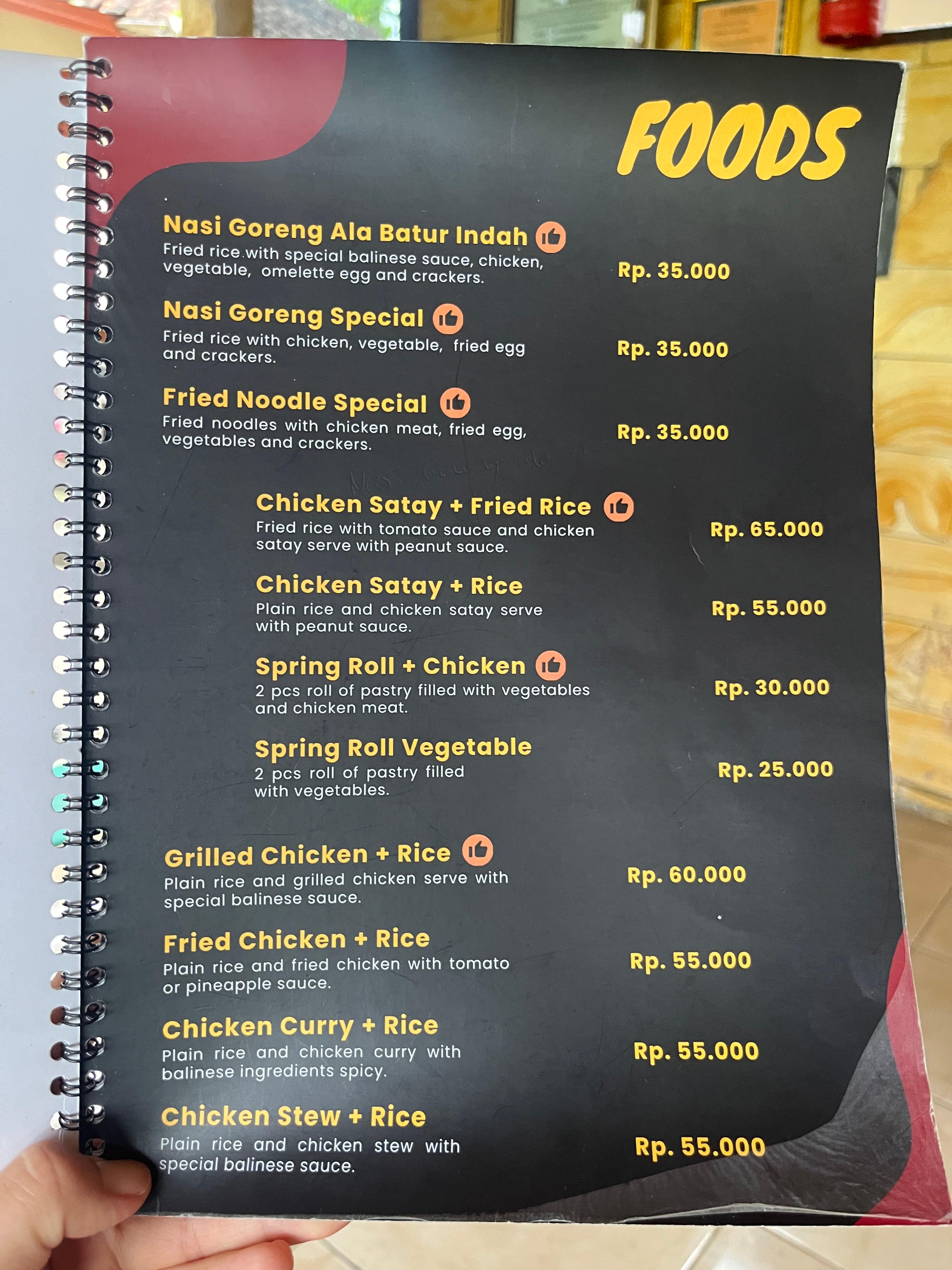 숙소을 옮기기 전 점심을 부실하게 먹어서 도착하자마자 애들이 배고프다고 칭얼거렸다. 숙소에서 조금 쉰 다음 짐을 풀고 바로 옆에 Pondok Batur Indah Restaurant에 가서 나시고랭 (35Kx2), 사태 (55K), 가도가도 (35K) 그리고 전통주 아락 (25K) 을 먹었다. 사태랑 가도가도는 진짜 맛있었고 아이들이 많이 먹었다.