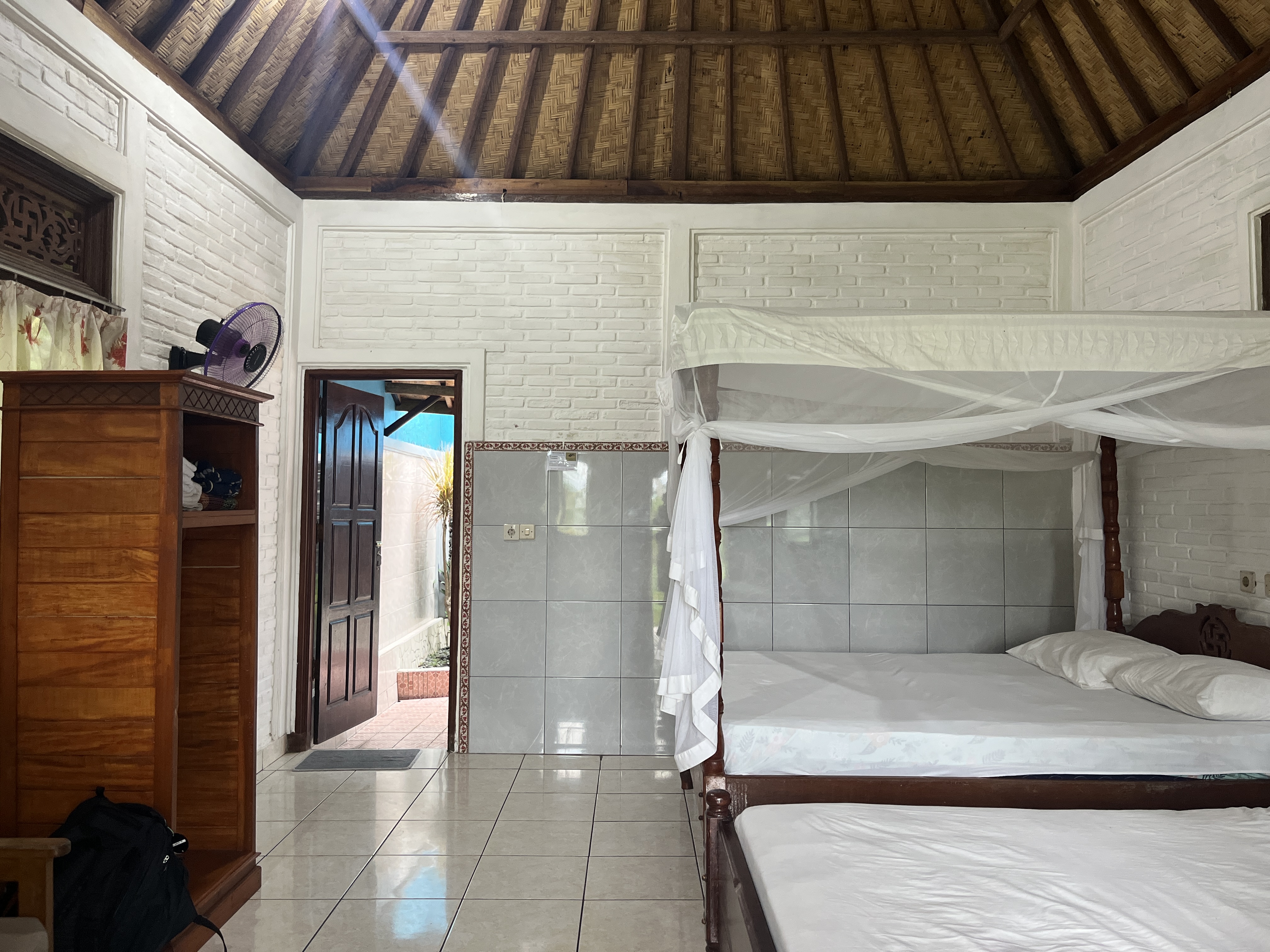 도마뱀이 있어서인지 개미나 나방 말고는 다른 벌레를 거의 보지 못했고, 모기도 없어 의외로 꽤 쾌적했다. 불을 끄고 다시 천장을 바라보니, 반딧불이들이 8자를 그리며 천천히 날아다니고 있었다. 가끔 천장에서 바닥으로 도마뱀 똥이 떨어지는 소리도 들렸다. 그래서 침대 캐노피 그물 위에 검은 덩어리들이 있었던 모양이다. 음...동남아시아 침대에 캐노피가 있는 이유를 알겠다.